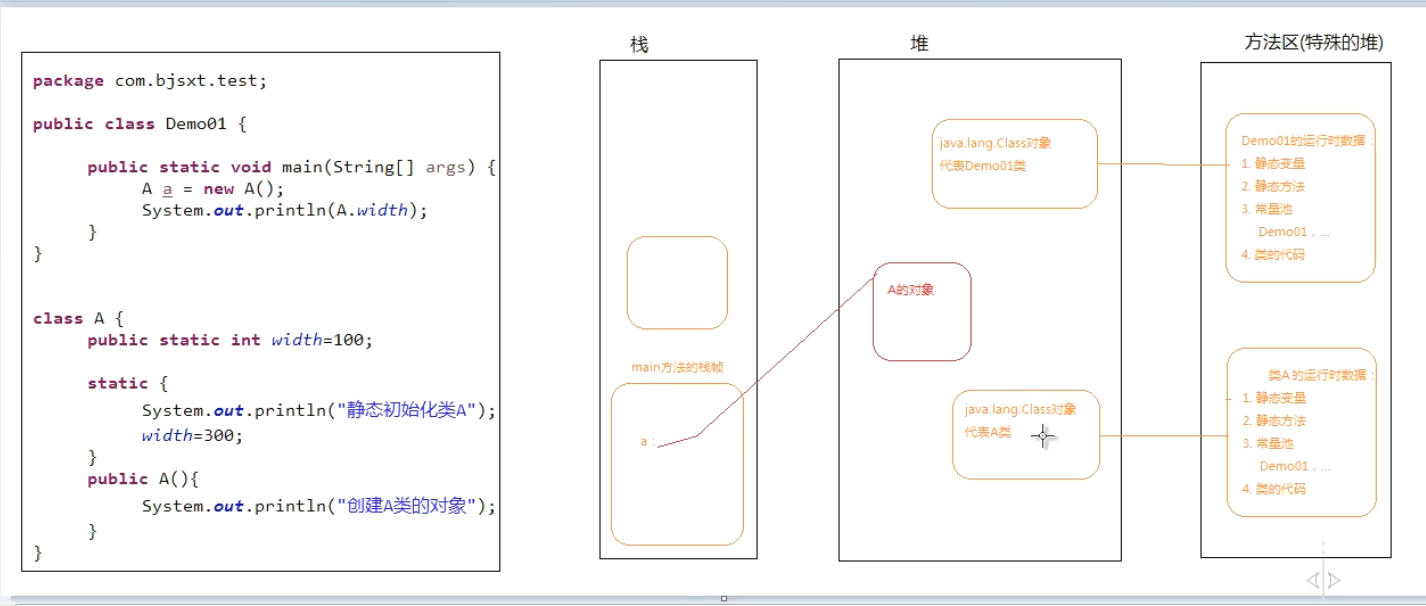 方法区获取到每个class 的运行时数据,同时也进行静态变量和方法的初始化。之后才产生一个与之对应的在堆中的代表这整个类的java.lang.Class对象。之后才执行代码。main方法执行时,会在栈中生成一个栈帧(每个方法执行时,都会生成一个自己的栈帧)。