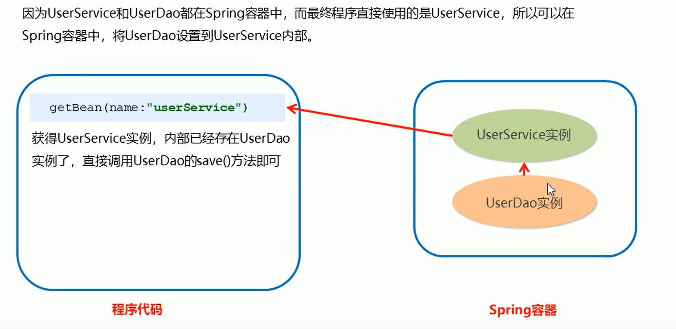 若把UserService实例与UserDao实例都存在Spring容器中,当前的做法是在容器外部获得UserService实例和UserDao实例,然后在程序中进行结合。